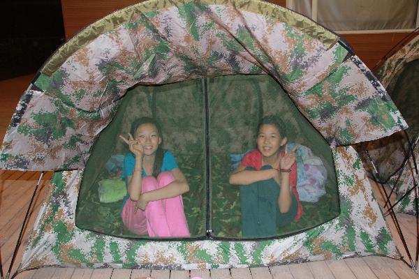 营地现有5000㎡的草坪广场,可供组织大型户外活动,及夏季露营。同时营地提供安全便捷的露营帐篷及配套设备,让人们切身感受到户外露营的乐趣。在天气较为寒冷的季节,露营帐篷可移至多功能活动中心,体验室内露营的感觉。青少年们可以分组体验搭建帐篷的过程,并在工作人员的指导下学习生存知识。露营项目可接纳100人。